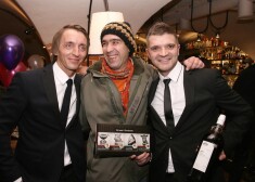 Mārtiņš Sirmais sveic Andri Reizenbergu (no kreisās) un Pēteri Repečko viņu bāra atklāšanā.
