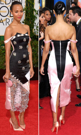 Atzinību stila ekspertu vidū izpelnījās Saldanas burvīgā modes nama „Prabal Gurung“ kleita. Aktrisei kājās ir satīna „Christian Louboutin“ kurpes 1000 dolāru vērtībā un pusotru tūkstoti vērta „Bottega Veneta“ soma. Arī Zoe izvēlējusies zīmola „Lorraine Schwartz“ rotaslietas. Viņas pirkstu rotā aptuveni 2,5 miljonus vērts gredzens kura centrā ir 10 karātu briljants, kurš ieskauts mazākos briljantiņos. Briljanti rotā arī aktrises ausu ļipiņas, un pat matus saņem briljantiem greznota matu rota.