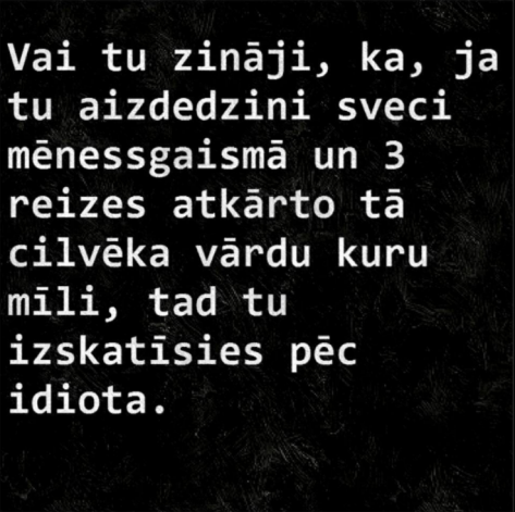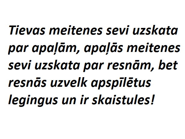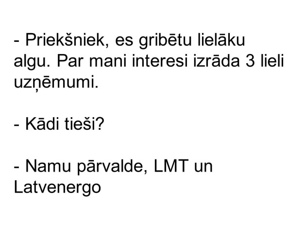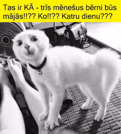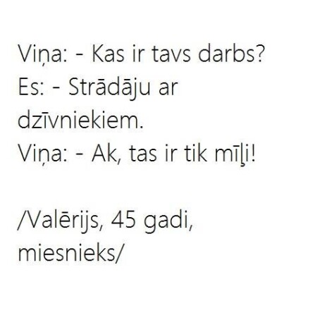 Sieva atgriezusies mājās un stāsta vīram: – Es tikko biju kaķu izstādē. Tur visi bija tādi skaistuļi! Es, protams, mīlu mūsu Murīti, bet salīdzinājumā ar citiem viņš ir pilnīgs ķēms. Vīrs: – Kā es tevi saprotu. Kamēr tu biji izstādē, pa televizoru rādīja konkursu “Mis pasaule”…