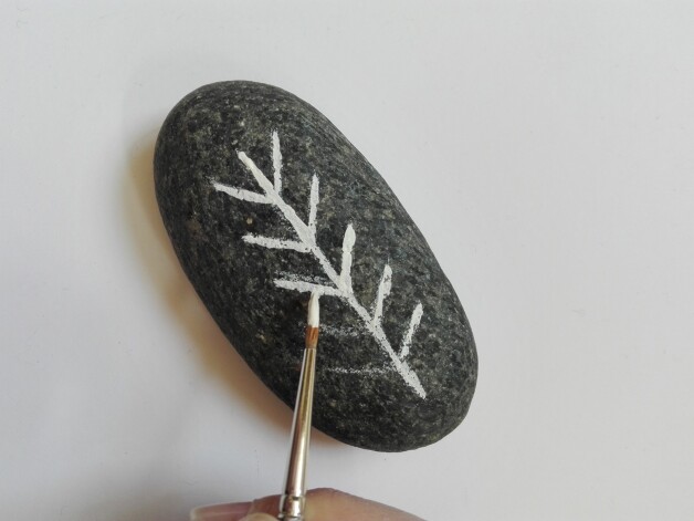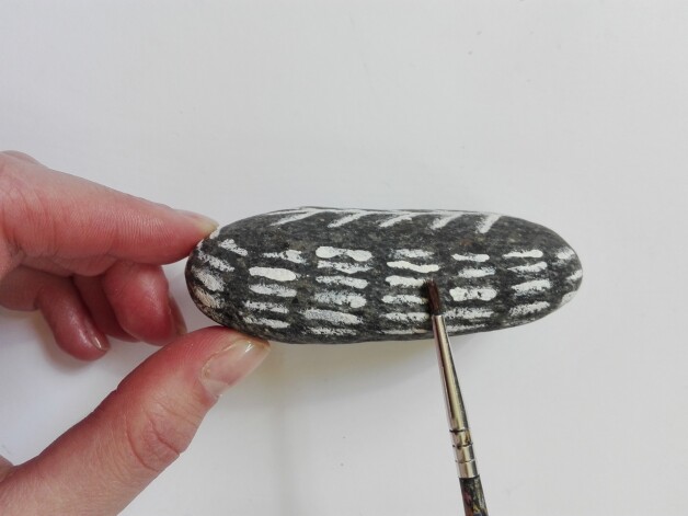 2. Ar smalku otiņu pārvelc uzzīmētajam akrila krāsu. Pēc krāsas nožūšanas zīmējumu vēl pielabo ar zīmuli, padarot kontūru maigāku. Akmens virsma ir nelīdzena, tādēļ, ja neesi profesionālis, krāsojums var neizdoties perfekts – zīmuļa krāsojums līniju iztaisnos un it kā saplūdinās ar akmens virsmu.
