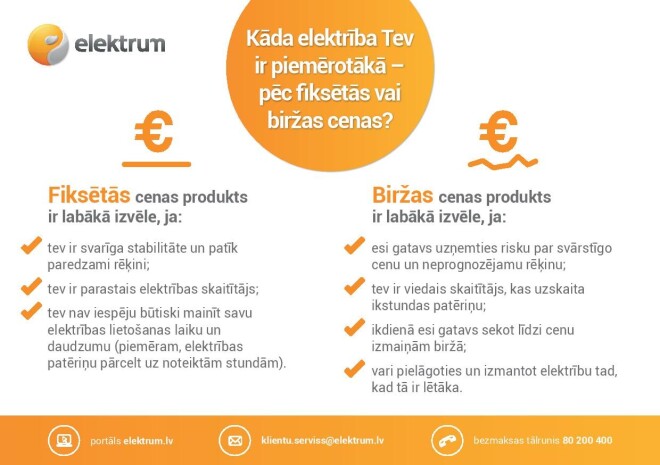 Savukārt, ja vēlaties stabilitāti un paredzamus izdevumus par elektroenerģiju, kā arī ja jums nav iespēju pielāgot savus patēriņa paradumus situācijai biržā, jums piemērotāks būs fiksētas cenas produkts – nemainīga elektroenerģijas cena par kilovatstundu uz 12 vai 24 mēnešiem.