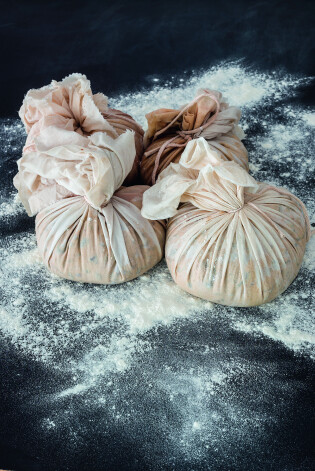 4. Sameklē lina vai kokvilnas auduma gabalus un izgriez no tiem kvadrātus, kuru diagonāles ir vismaz 2,5 reizes lielākas nekā formas diametrs. Vari lietot arī marli, tikai tad to ņem divās kārtās. Pārsedz ar to formu un apmēram centimetru zem formas malas apsien ar izturīgu auklu (nevajadzētu sintētiska materiāla). Auduma stūrus novelc un sasien katrus divus pretējos pudiņa virspusē. Sējumam jābūt tik ciešam, lai aiz tā var pacelt pudiņu.