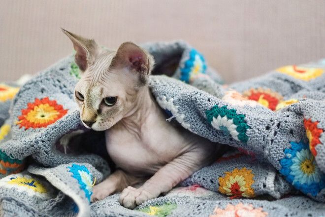 Kārtīga apspalvojuma trūkums padara kaķus jutīgus pret aukstumu un vēju – daudzi saimnieki saviem bezspalvainajiem draugiem gādā drēbes. Antra Ašaka savu kaķeni neģērbj pat uz izstādēm, jo mincis nav pieradis pie drēbēm.