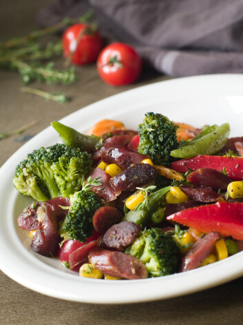 1. Desas sagriež slīpās šķēlītēs. Nomizo un sasmalcina sīpolu. Sīpolu un desas dažas minūtes apcep vokpannā vai lielā cepamajā pannā. Pievieno tikko no saldētavas izņemtus dārzeņus un cep vēl kādu brīdi.