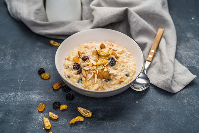 Pilngraudu auzu putra ar žāvētiem augļiem un mandeļu pienu