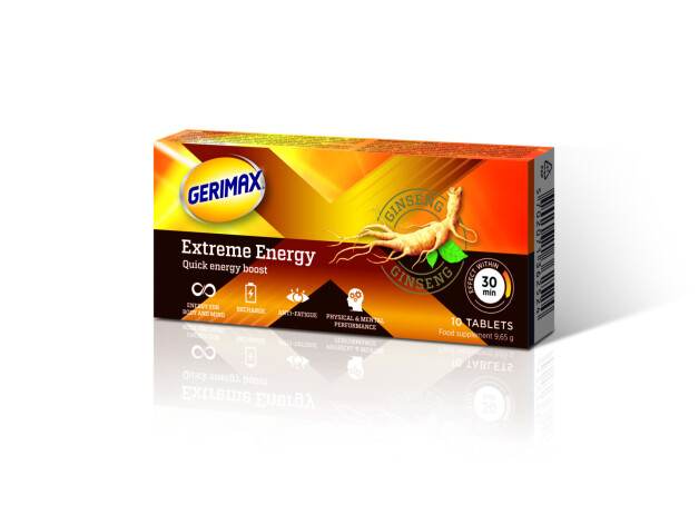 Gerimax Extreme Energy ir paredzēts ātrai iedarbībai, kad vajadzīgs tūlītējs “enerģijas lādiņš” ar ilgstošu efektu, ko nodrošina zeltsakne, žeņšeņs un guarana. Tas ieteicams cilvēkiem, kuriem ir liela fiziskā vai emocionālā slodze, lai ātri uzņemtu enerģiju un varētu turpināt darbus. Iedarbība vērojama jau 30 minūšu laikā. Ieteicams lietot situācijās, kad nepieciešams saglabāt modrību: veicot intensīvu darbu vai mācoties un gatavojoties eksāmeniem, arī garu pārbraucienu laikā.