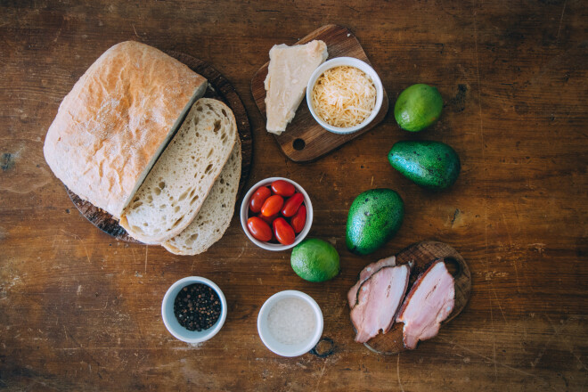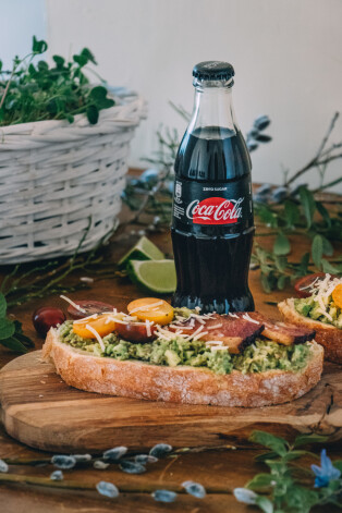 4. Kārto maizi – apakšā liek avokado salsu, tad bekona šķēlītes, ķirštomātus, pārber visu ar sieru un pasniedz kopā ar Coca-Cola.