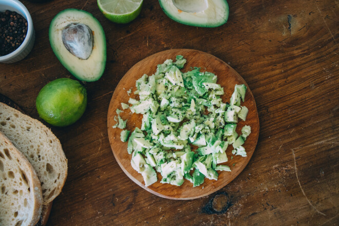 2. Avokado nomizo, izņem kauliņu un saspaida ar dakšiņu, pievieno laima sulu, sāli un piparus.