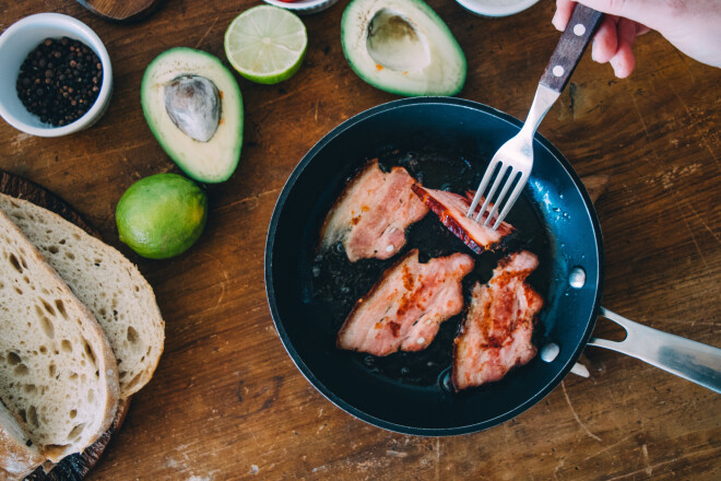 1. Bekona šķēles liek uz uzkarsētas pannas, apcep tās no abām pusēm 5-7 minūtes.