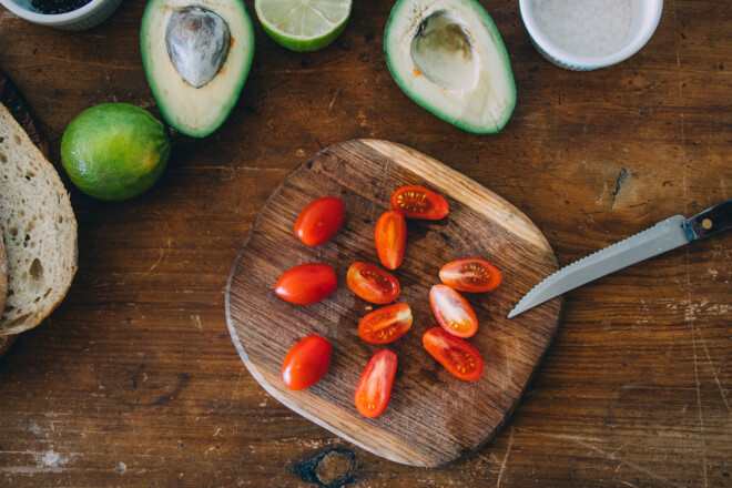 3. Ķirštomātus sagriež uz pusēm, maizi var uzgrauzdēt, ja vēlas.