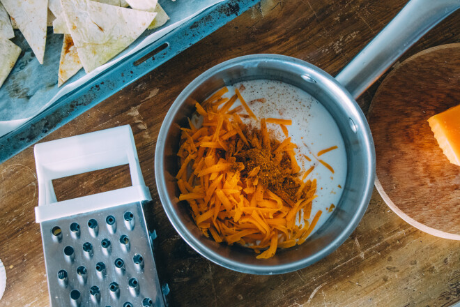 2. Katliņā lej saldo krējumu un uzsilda, Čederas sieru sarīvē un pievieno saldajam krējumam, pievieno arī otru ēdamkaroti tako garšvielas un sāli, visu samaisa un izkausē.