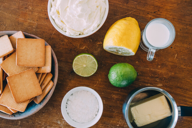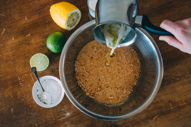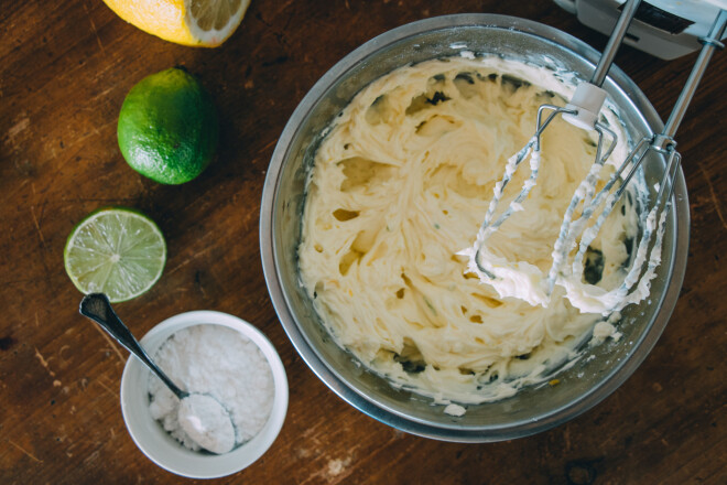 3. Bļodā liek Maskarpones sieru, vaniļas cukuru, pūdercukuru, citrona un laima sulas un miziņas – visu ar rokas mikseri samiksē viendabīgā masā, iemaisa želatīnu.