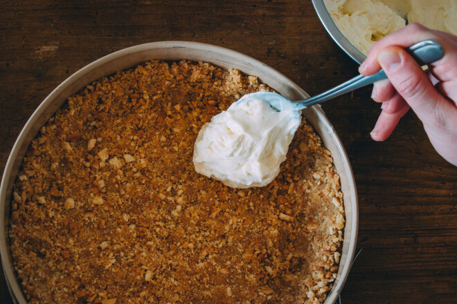 1. Izkausē sviestu, cepumus sasmalcina un sajauc ar sviestu, masu liek kūkas formā.