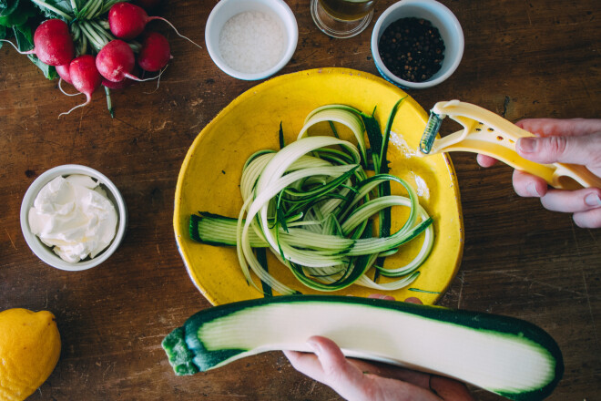 1. Cukini sarīvē ar nūdeļu rīvi.