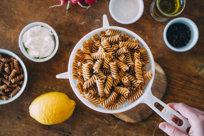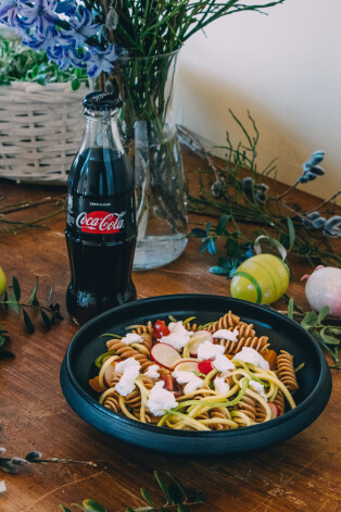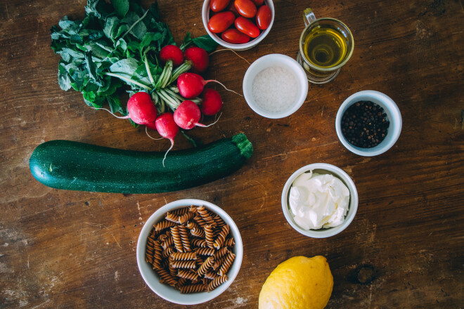 5. Bļodā kārto cukini nūdeles, redīsus, pilngraudu makaronus, ķirštomātus un sajauc ar mērci.