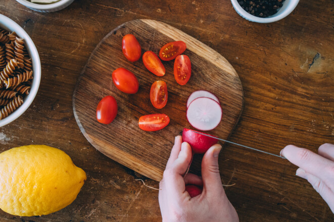 2. Redīsus sagriež ripiņās un ķirštomātus sagriež uz pusēm.