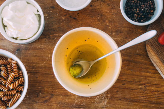 4. Nelielā bļodiņā sajauc olīveļļu, citronu sulu, sāli, piparus.