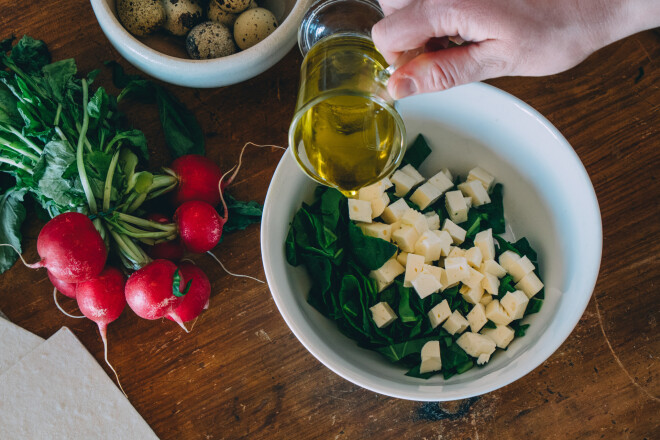 2. Fetas sieru un spinātus smalki sagriež, sajauc ar olīveļļu.