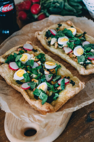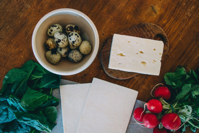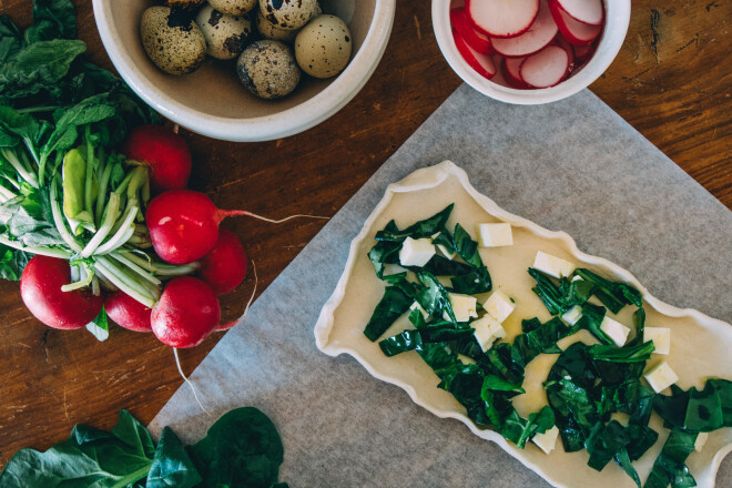 Kārtainās mīklas tarte ar fetas sieru, spinātiem un paipalu olām