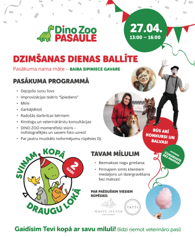 DINO ZOO PASAULE - Baltijā lielākais centrs dzīvniekiem un viņu saimniekiem, svin 2 gadu jubileju, tāpēc aicina visus dzīvniekmīļus 27. aprīlī pulcēties uz vērienīgo jubilejas ballīti.
