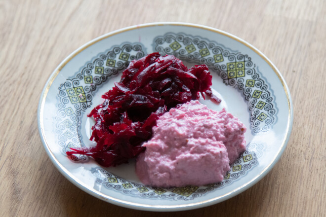 Vārītas bietes sarīvē uz rīves ar visu mizu, pievieno mērci, blenderē 400 gramus jāņogu, 200 gramus sezama sēklu, 300 gramus ūdens, sāli. Iznāk labāk nekā pulvera majonēze. Pat aizdomas nerodas, ka tur varētu būt kas neveselīgs.