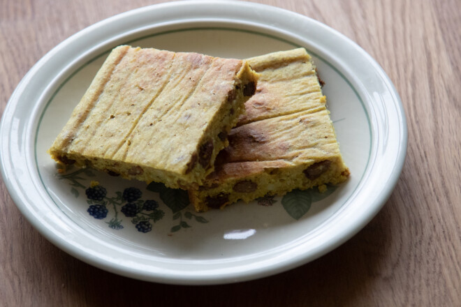 Sastāvā ir 0,5 kg šķelto zirņu, 0,5 kg auzu pārslu, 200–300 g riekstu, kurus visus sablenderē. Tad ir 400–500 g rozīņu un viena tējkarote kurkumas. Rozīnes liek pēdējās, tās nevajag plēst. Visu samaisa, rozīnes iecilā. Uzliek uz pannas, 35 minūtes cep 200 grādu temperatūrā. Ja brokastīs apēdīs vienu līdz divas šķēles, tad vēders būs pilns. Ūdens šo maizi uztur svaigu – apklāj ar slapju dvieli, un tā atkal ir mīksta, var nedēļu stāvēt. To Māris gatavo veikala maizes vietā, kam, salīdzinot ar šo, ir mazāka uzturvērtība.