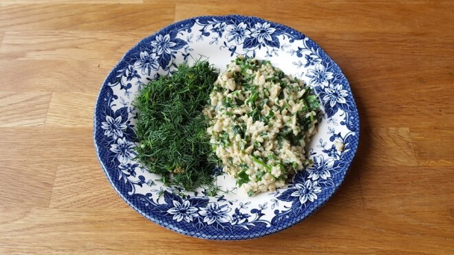 Auzu pārslas (divas trešdaļas krūzes) un ūdeni (krūzi) vāra katlā. Kad šķiet gatavas, nepārtraucot karsēšanu, iemaisa sagrieztas balandas (piespaidīta krūze), blenderētas saulespuķu sēklas (1/4 krūzes), saulespuķu eļļu (1/5 krūzes) un garšvielas. Samaisa, uzliek vāku, pārtrauc karsēt un pēc desmit minūtēm esi pie galda.