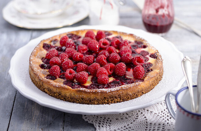 3. Izslēdz cepeškrāsni un atstāj sierakūku, lai tā palēnām dziest. Kad tā ir pilnīgi atdzisusi, izņem no krāsns, pārsmērē ar skābo krējumu, ko esi atlicinājusi virsiņai, pārsmērē ar citronkrēmu un pārkaisi ar avenēm. Gatavs!