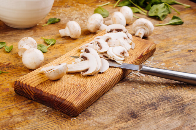 1. Dziļā pannā pievieno olīveļļu, sakapātus sīpolus un uz vidēji lielas uguns cep un maisa līdz tie kļūst caurspīdīgi, tad pievieno sagrieztus šampinjonus, apcep.