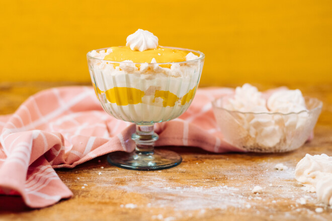2. Traukā pa kārtām liec putukrējumu, bezē cepumus un "Rūdolfs" mango, kokosa krēmu un pasniedz.