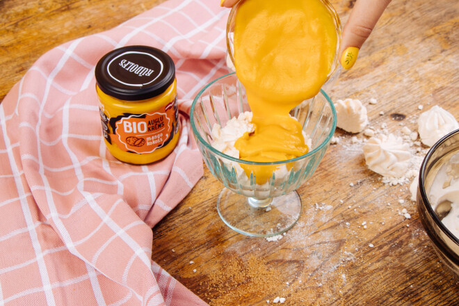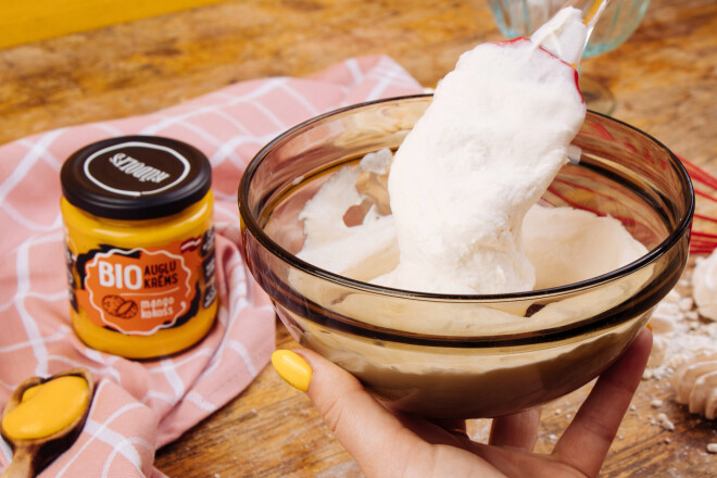 1. Saputo saldo krējumu ar cukuru līdz veidojas bieza masa, sadrupina bezē cepumus.