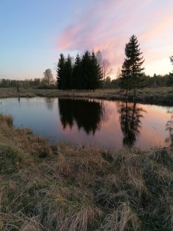 Aiz mājas ir dīķis.