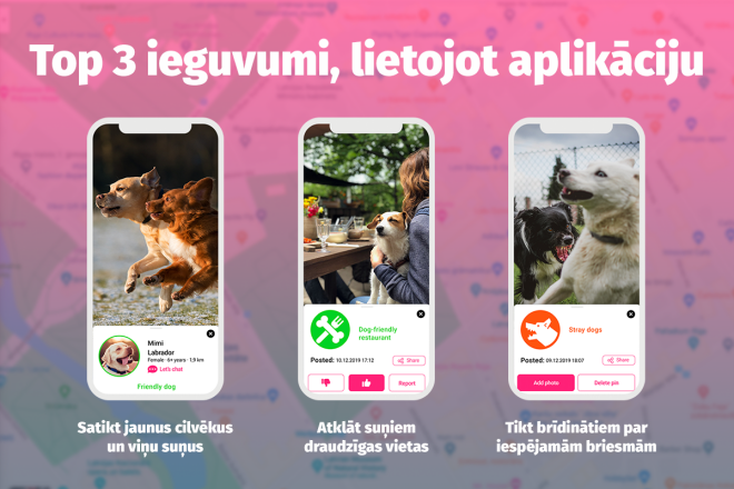 - Lietotnes iekšienē atrodama ērta karte, kurā varat atrast noderīgus ieteikumus. Kur atrodas lieliskas pastaigu vietas, kur tuvumā atrodamas urnas suņu ekskrementiem. Paši lietotāji aktīvi veic atzīmes par saviem ceļā sastaptiem atradumiem un šķēršļiem - no suņiem draudzīgām kafejnīcām līdz pat brīdinājumiem par saplēstu stiklu vai aizdomīgu ēdienu uz zemes. Tāpat lietotnē varat atzīmēt, ka redzējāt noklīdušu, apjukušu suni ar kaklasiksnu, vai izziņot saucienu pēc palīdzības, ja esat pazaudējis savu mīluli. Tas operatīvāk palīdzēs pazudušajam rakarim atgriezties pie saimnieka.