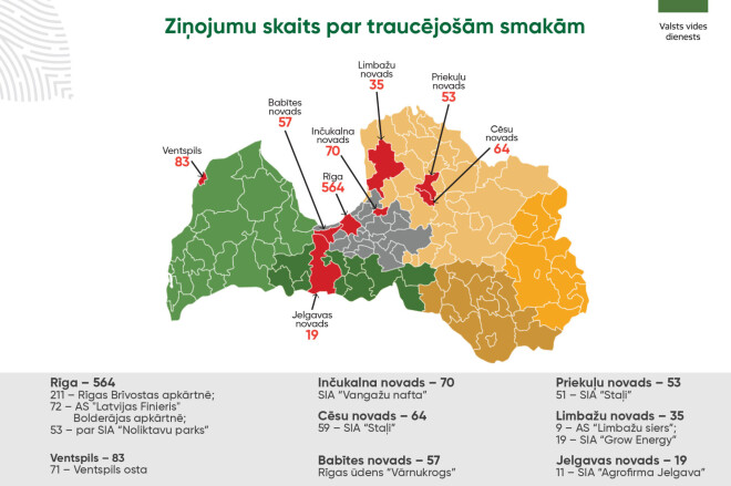 Tāpat VVD saņēmis salīdzinoši daudz sūdzības par traucējošu smaku Pierīgas novados – Inčukalna novadā (visi ziņojumi par SIA “Vangažu nafta” darbību) un Babītes novadā (visi ziņojumi saistīti ar SIA “Rīgas ūdens” dūņu uzglabāšanas lauku “Vārnukrogs” darbību).