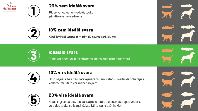 “Mājas apstākļos par palīgu var kalpot kondīciju tabulas. Sunim un kaķim būtu jābūt viegli sataustāmām ribām; skatoties uz savu dzīvnieku no augšas, ir jābūt redzamai vidukļa līnijai, bet, raugoties no sāna, nedrīkst būt nokarājies vēders. Ja šie kritēriji neatbilst normai, ir pamats domāt, ka dzīvniekam ir aptaukošanās un jāvēršas pie sava veterinārārsta, lai sastādītu saudzīgu svara samazināšanas plānu”, norāda Anete Kalniņa.