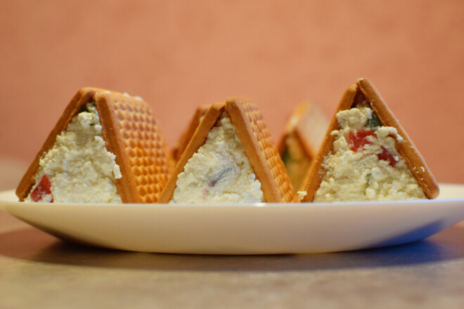 4. Lipina kopā mājiņas – paņem divus cepumus, sastutē tos ar maliņām kopā, ieliek ēdamkaroti biezpiena un piespiež klāt trešo cepumu. Liek gatavo mājiņu uz šķīvja.