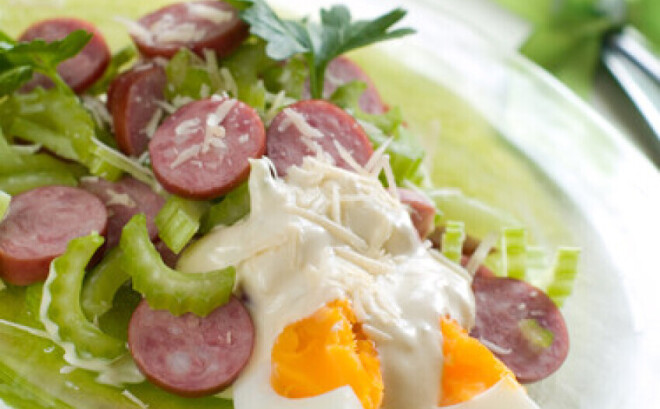 Ideja brokastīm pēc Lieldienām - olu salāti ar cieto sieru un desiņām par 1,36 EUR