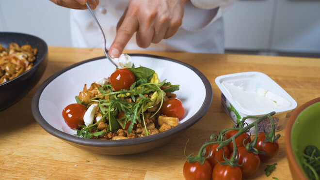 Vidēji lielos gabalos sagriež šampinjonus, cāļu filejas un tomātus, smalkākos kubiņos griež cūkas karbonādi. Sakarsētā panna izkausē sviestu un apcep šampinjonus līdz tie kļūst zeltaini brūni, apkaisa tos ar sāli un pipariem. Pievieno cūkas karbonādi un cāļu filejas. Visu cep, kamēr svaigā gaļa pilnībā izcepusies, apmēram 5-7 minūtes. Pievieno sinepes, sojas mērci un tomātus, apcep vien dažas minūtes. Visu izkārto dziļākā šķīvī vai bļodā, pa virsu pārber zaļumus, krēmsiera piciņas un pāris svaigus tomātus. Salāti labi garšos gan silti, gan atdzisuši.
