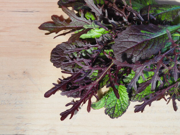 ● Mizuna – pēc izskata mazliet atgādina rukolu, taču pēc garšas ir maigāka un drīzāk līdzinās Ķīnas kāposta garšai. Tai patīk mitra, silta augsne, ne pārāk saulaina un ne pārāk ēnaina vieta. Ātri sadīgst, pirmās lapiņas var plūkt jau pēc 2–3 nedēļām, pēc 4–6 nedēļām izveidojas rozetes ar 20–30 cm garām robainām lapiņām. Sākumā noplūc pa vienai ārējās, lielākās lapas, pēc tam jau vari nogriezt visu rozeti. Pēc dažām dienām tās vietā augs jaunas lapiņas.