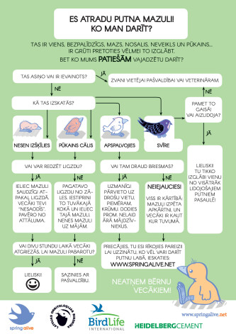 “Ik gadu saņemam satrauktus jautājumus par to, ko darīt ar atrastu putnu mazuli. Vēršam uzmanību, ka putnu mazuļi nav jāglābj. Putni mēdz atstāt ligzdas, vēl nemācēdami lidot. Vecāki vēl aizvien pieskata šos putnus. Paturot prātā, ka vairākas putnu sugas arī ligzdo uz zemes, tur atrastie putni visticamāk atrodas savā īstajā vietā,” skaidro Latvijas Ornitoloģijas biedrības ornitologs Agnis Bušs.