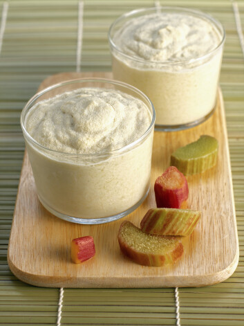 2. Kamēr rabarberi vārās, iemērc želatīnu aukstā ūdenī. Kad tas uzbriedis, izspied šķidrumu. Izšķīdini karstajā biezenī, mazliet atdzesē, bet neļauj sastingt.