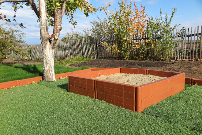 * Lai smilšu kastē pēc lietus neuzkrātos ūdens, izveido pareizu pamatni: pa visu perimetru 30 cm dziļumā noņem augsnes slāni, centrā izroc 50–70 cm dziļu bedrīti, piepildi ar granti vai oļiem un pieblietē, izveidojot nelielu slīpumu no malām uz centru.
