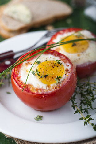 4. Maisījumu iepildi tomātos. Olas pa vienai iesit mazā bļodiņā un uzmanīgi uzslidini uz pildījuma.