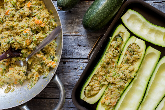 4. Maisījumu pildi cukīni pusītēs. Liec sacepumu veidnē, kas ieziesta ar eļļu. Ievieto 200 grādu karstā cepeškrāsnī un cep aptuveni 30 minūtes.