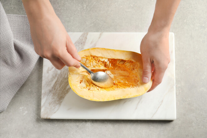 1. Cukīni pārgriez gareniski uz pusēm un ar spicu karotīti izkasi nedaudz mīkstuma, ko sakapā.