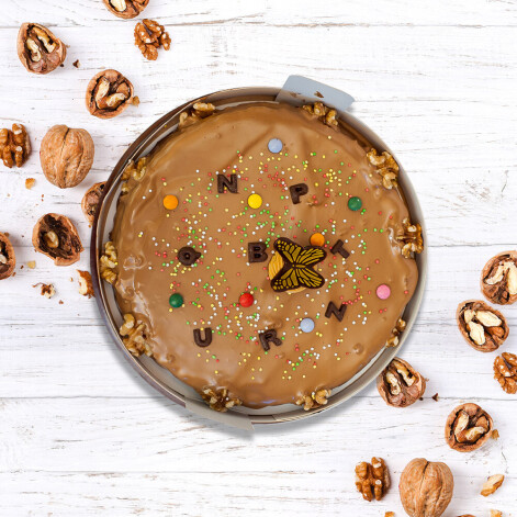 Gatavota no olu biskvīta, ar valriekstiem un īstu medu, pildīta ar īstu saldkrējuma sviestu un vārītā iebiezinātā piena krēmu. Tortes virsma bagātīgi pārlieta ar tumīgu lazdu riekstu glazūru un tās dekori ir pašu rokām gatavoti „Lāču” ceptuvē. Torte ir krāšņi dekorēta jaunā mācību gada noskaņās, bet sānos rotāta ar veseliem valriekstiem.”Valriekstu tortes” tapšana ir sarežģīts un darbietilpīgs process, roku darbs, tomēr rezultāts ir to vērts!