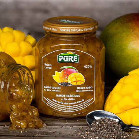 Latvijā gandrīz 50% pircēju izvēlas baudīt neparastas un eksotiskas garšas, tāpēc arī “Pūre” ir paplašinājusi savu ievārījumu klāstu. Jaunā ievārījuma sastāvā ir augļu karalis mango apvienojumā ar čijas sēkliņām, kas ir brīnišķīgs antioksidantu proteīna, Omega 3 un Omega 6 taukskābju avots. Augsta kvalitāte un izcila garša – kā mājās gatavotam ievārījumam. Nogaršo to Latvijas nacionālajā kopstendā!