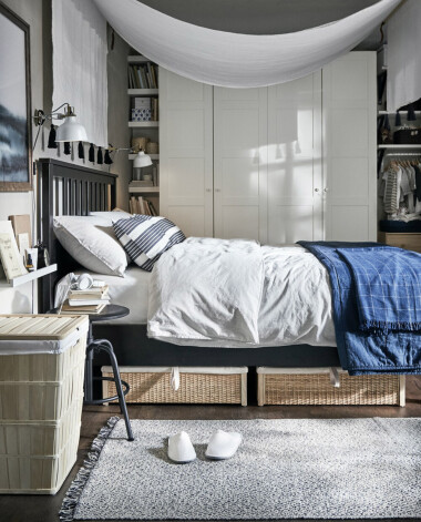 “Nelielās telpās lielākais izaicinājums ir atrast pēc iespējas vairāk vietas mantām un atstāt pietiekami daudz brīvas telpas kustībai. Mantas var glabāt skapjos un plauktos, taču noteikti der apsvērt arī iespēju salikt kaut ko pagultē. Ērti, ja gultas rāmim jau ir iebūvētas atvilktnes vai plaukti, taču, ja tādu nav, var izvēlēties izvelkamas kastes,” rekomendē IKEA interjera dizainers.