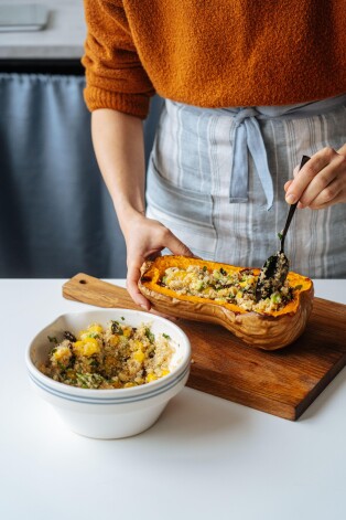 5. Krāsnī ceptajiem ķirbīšiem izņem sēklotni un glīti izdob vidiņu. Piepildi ar pagatavoto maisījumu.