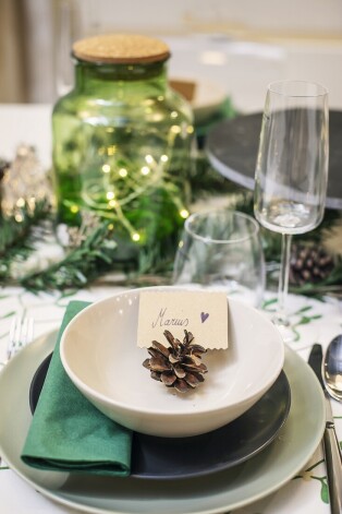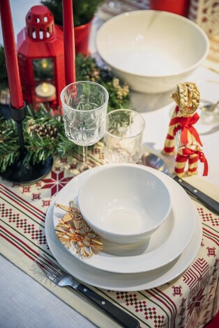Lai izveidotu skaistu galda noformējumu, nebūt nav jāpērk jauni trauki. Var izmantot esošos šķīvjus pat tad, ja tie ir dažādās krāsās – tādā gadījumā vienojošais elements būs galda rotājumi. “Var izveidot galveno dekoru, ko novieto galda vidū, piemēram, tā var būt pavisam neliela, ar lampiņām rotāta eglīte. Arī katrā šķīvī var ielikt vienādu dekoru, kas saskan ar galda galveno rotu. Katrs viesis šķīvja dekoru varēs paturēt sev par piemiņu par svētku vakariņām,” stāsta Rimkus.